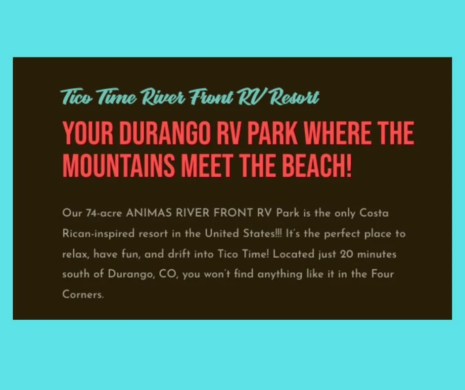 Reservations for Full Hook-Up RV Camping are made directly with Tico Time RV Resort. Please call 970-903-0681